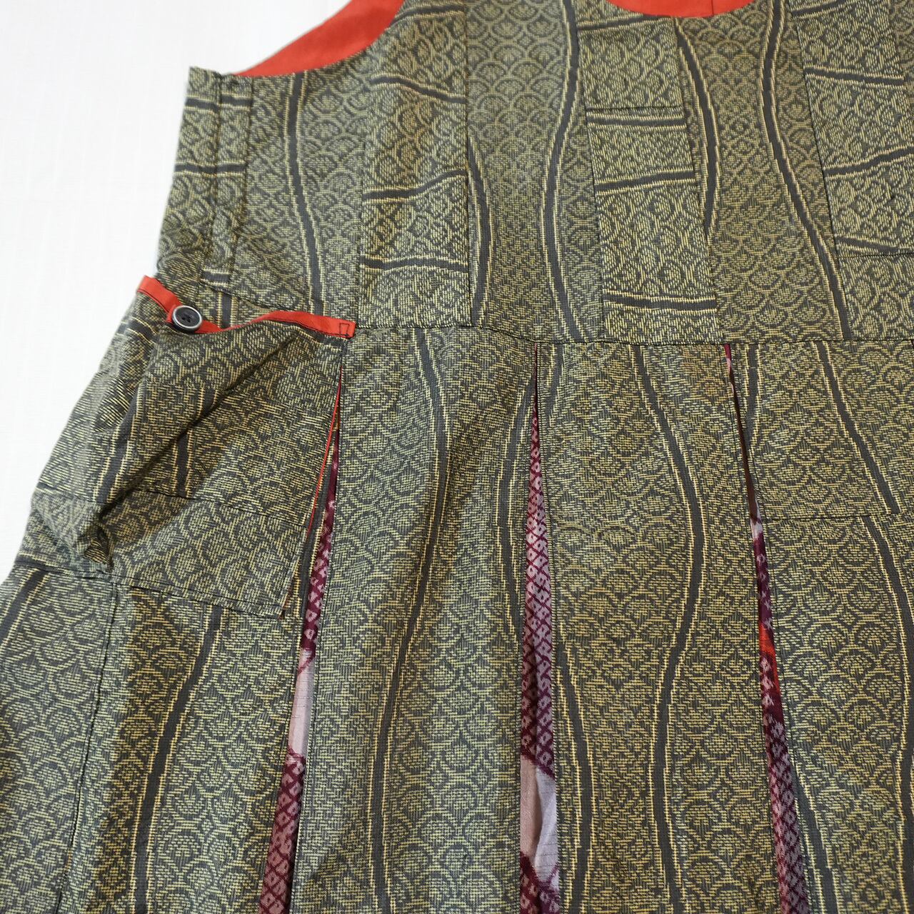 立涌柄グリーンワンピースは、アンティークの銘仙着物と大島紬から丁寧に仕立てられたワンピースで、グリーンの立涌柄に銘仙の鮮やかな色彩が華やかさを添えています。
